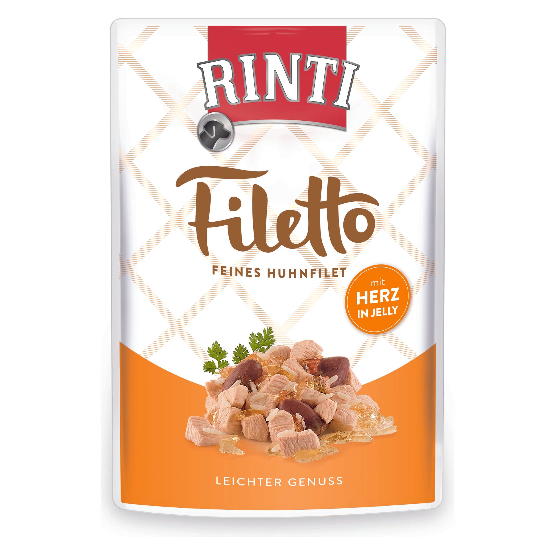 RINTI Filetto - Helle Filetstückchen vom Huhn in delikater Jelly, garniert mit Hühnerherz, zubereitet im Rinti-Schonverfahren. Diese Fleischmahlzeit ist nicht nur leicht verdaulich, sie bietet dem Hund auch ein besonderes Geschmackserlebnis.